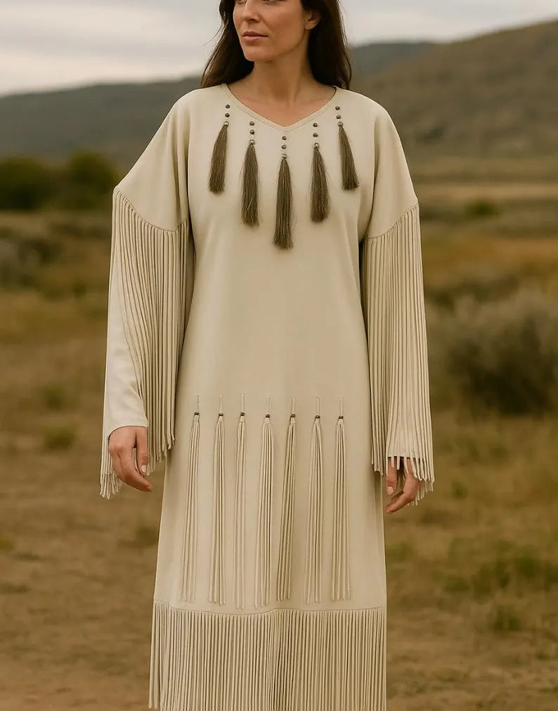 Celebrate tradition and elegance with this Women’s Leather Long Fringe Dress, inspired by Native American Plains Indian regalia. Handmade from genuine leather, this maxi dress features long tassels, intricate detailing, and a flowing design that reflects cultural beauty and craftsmanship.