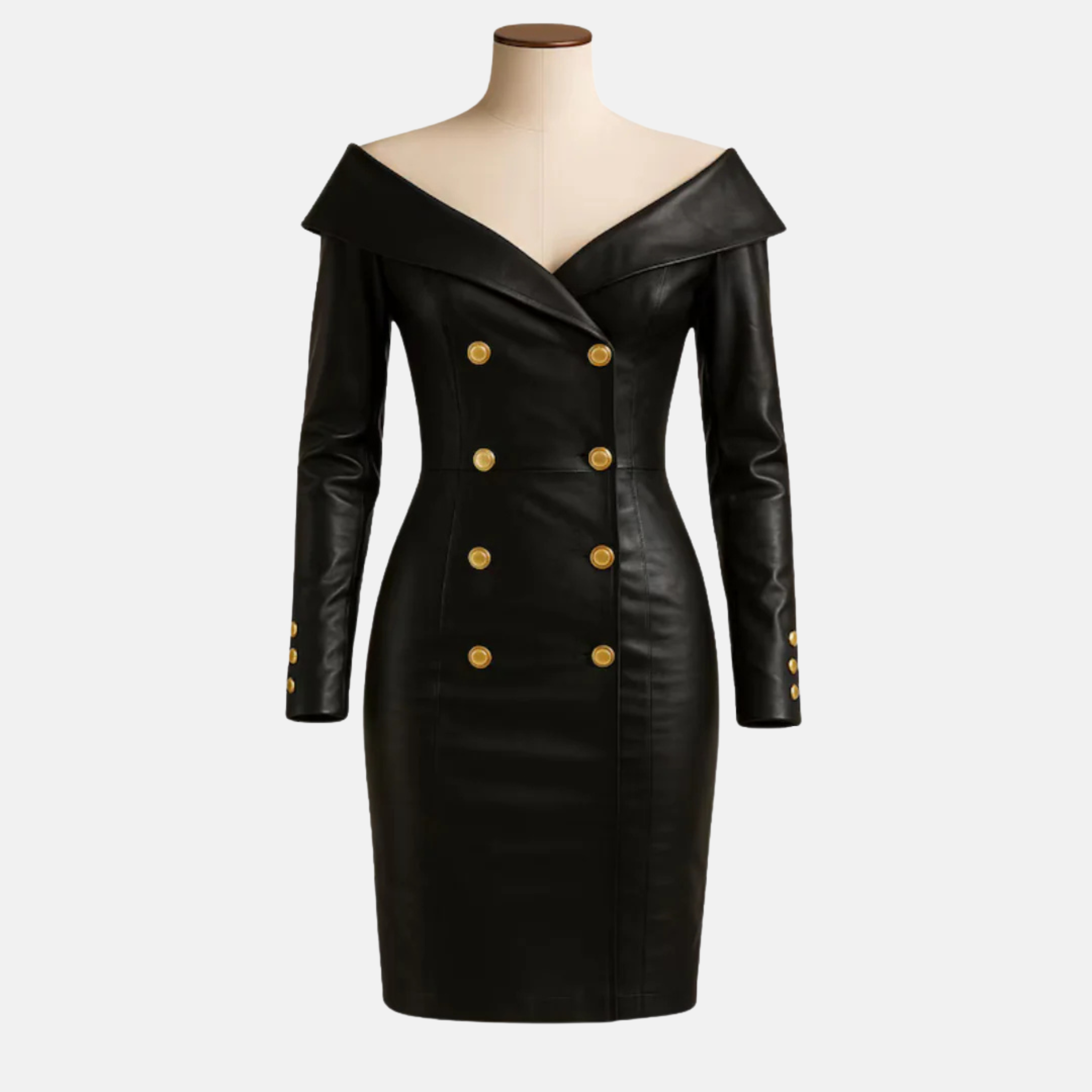 Step into bold elegance with this Handmade Women’s Black Leather Off-Shoulder Bodycon Dress, crafted from 100% genuine leather. Featuring a sophisticated off-shoulder neckline, a flattering slim-fit silhouette, and gold button detailing for a touch of military-inspired luxury, this mini dress is designed to make a statement.