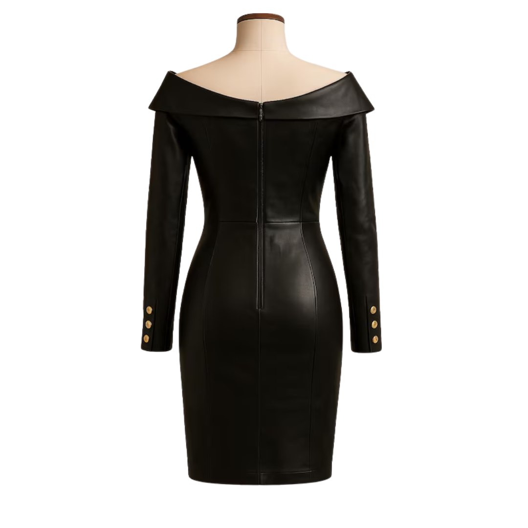 This dress is perfect for buyers searching for women’s leather cocktail dresses, off-shoulder bodycon leather outfits, black leather party wear, and handmade luxury leather fashion.
