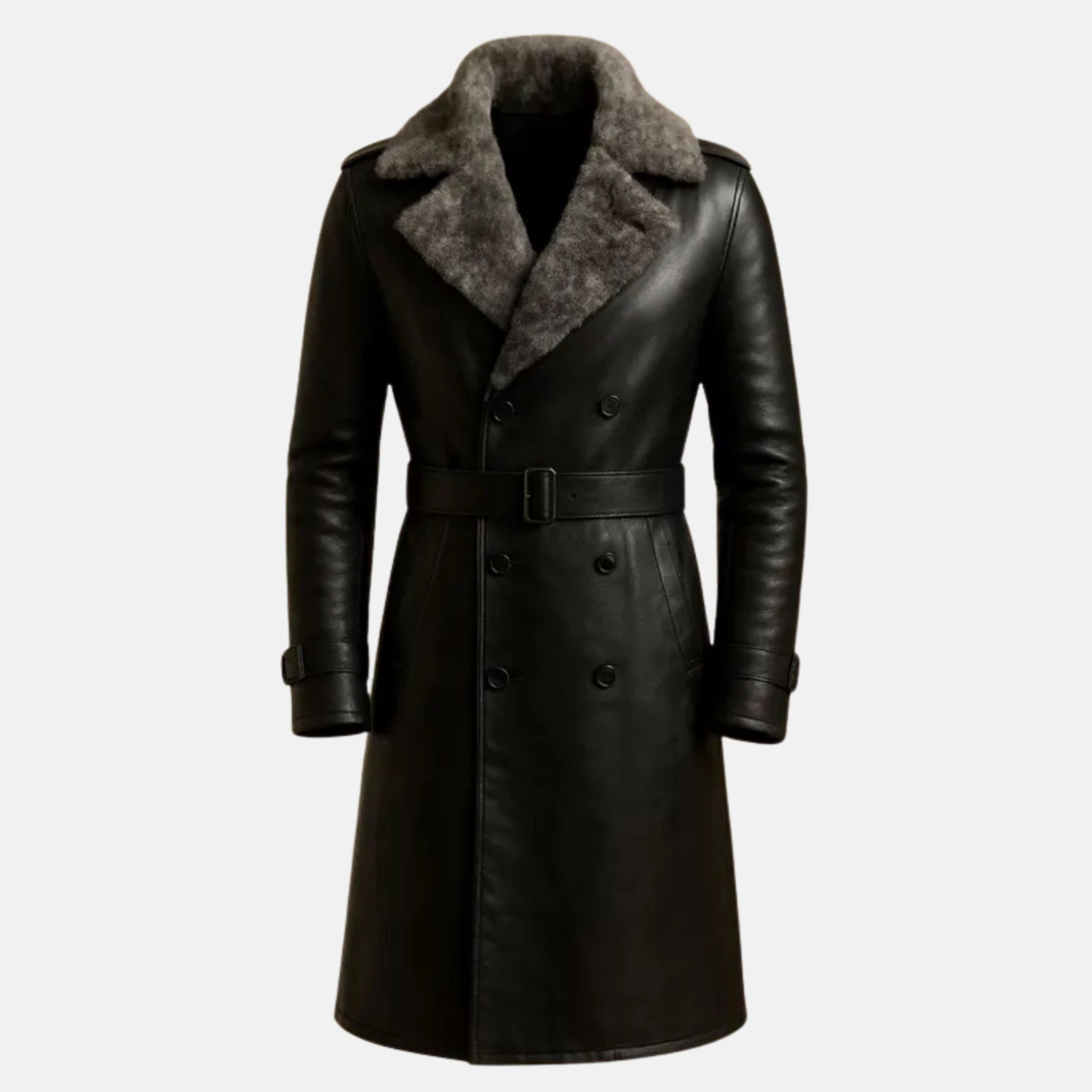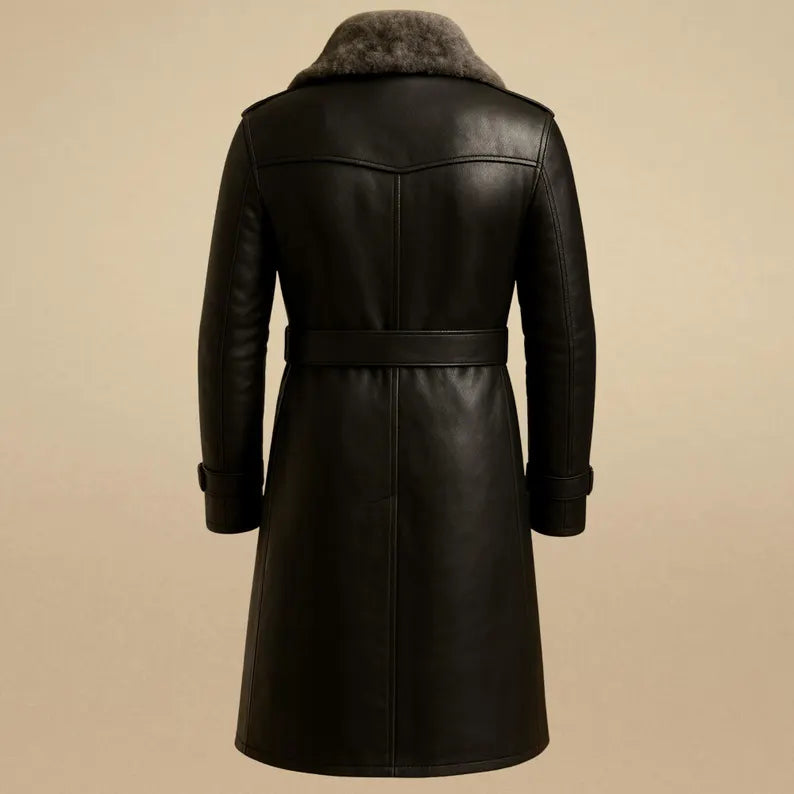 Stay warm and stylish this winter with our men’s long black leather trench coat, featuring a luxurious faux fur collar and a classic belted design. Made from 100% genuine leather, this handcrafted coat combines timeless elegance, warmth, and rugged sophistication — perfect for winter wear and formal occasions.