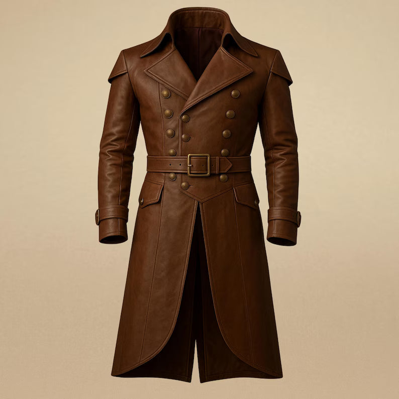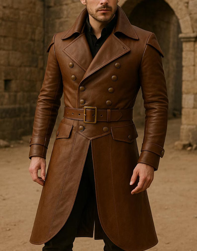 Step into timeless style with this men’s brown double-breasted leather trench coat, handmade from 100% genuine leather. With its structured shoulders, detailed button front, and belted waist, this coat brings together luxury craftsmanship and bold vintage appeal — perfect for winter, fall, or formal wear.