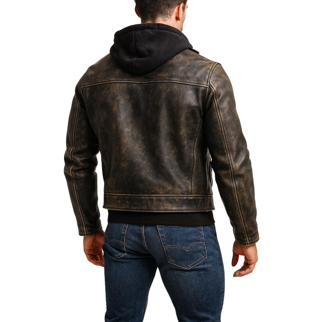 Crafted from 100% premium cowhide leather, its deep bronze-black distressed tone carries timeless rugged charm while retaining a refined, urban edge.