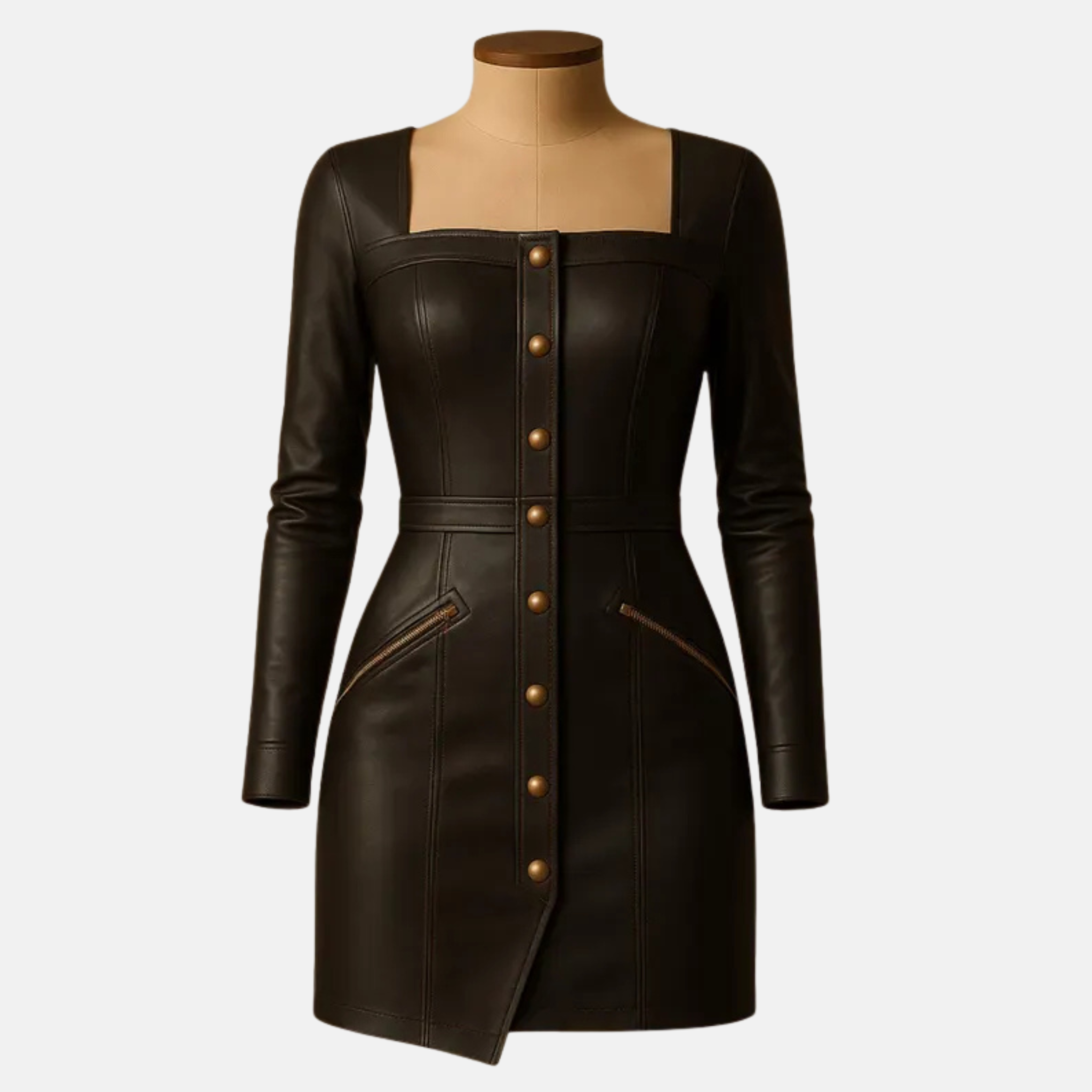 This fitted mini dress features a clean square neckline, gold-tone buttons along the front, and two stylish front pockets. It’s tailored to accentuate your natural shape while offering comfort and sophistication. The craftsmanship reflects premium quality — every stitch is handmade with attention to detail.