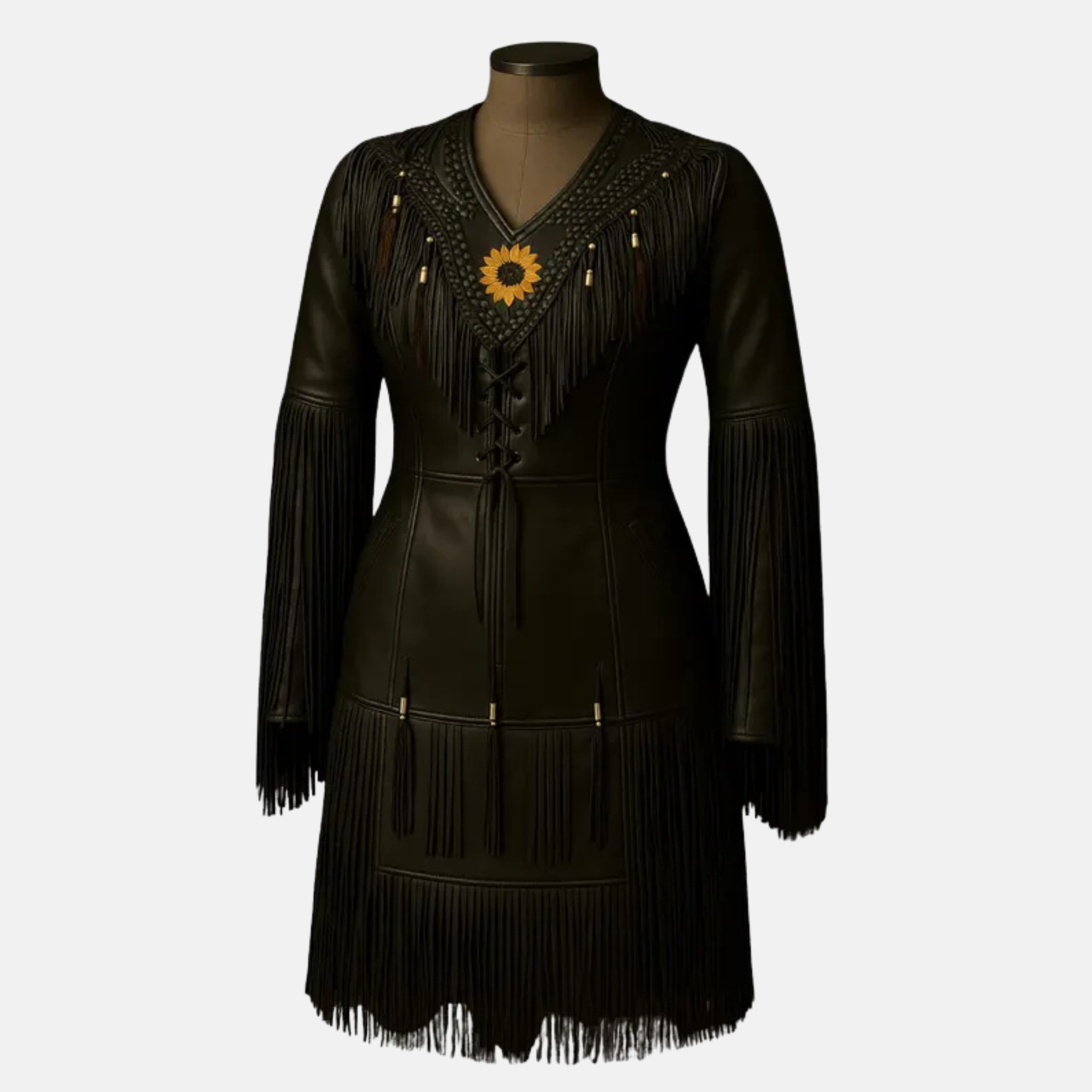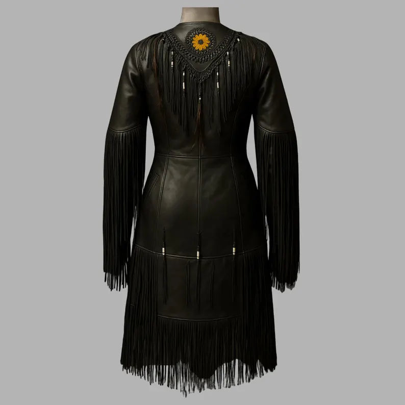 Crafted from premium genuine leather, this dress combines durability with beauty, making it ideal not only for weddings but also for powwow ceremonies, cultural events, rodeo fashion shows, and festivals. The flowing long fringe design adds movement and authenticity, while the handmade craftsmanship ensures every piece is unique.