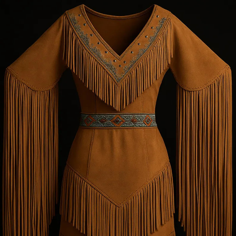 Celebrate heritage and handcrafted beauty with this Handmade Tan Leather Fringe Dress, a stunning piece of Powwow regalia inspired by Native Western fashion. Made from premium tan leather, this elegant dress features hand-beaded detailing and long flowing fringe that move gracefully with every step.
