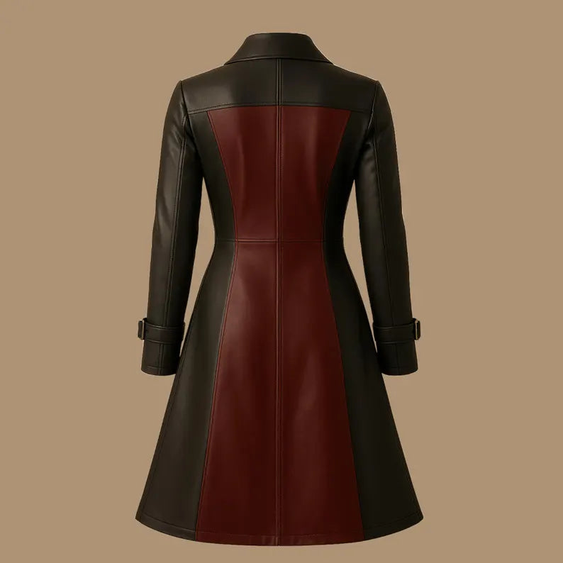 Turn heads with this Handmade Two-Tone Leather Coat for Women, crafted from premium genuine leather. Featuring a striking mix of black and dark brown panels with metal buckle details, this coat blends elegance with an edgy gothic flair. Perfect for those who love bold, statement-making outerwear.