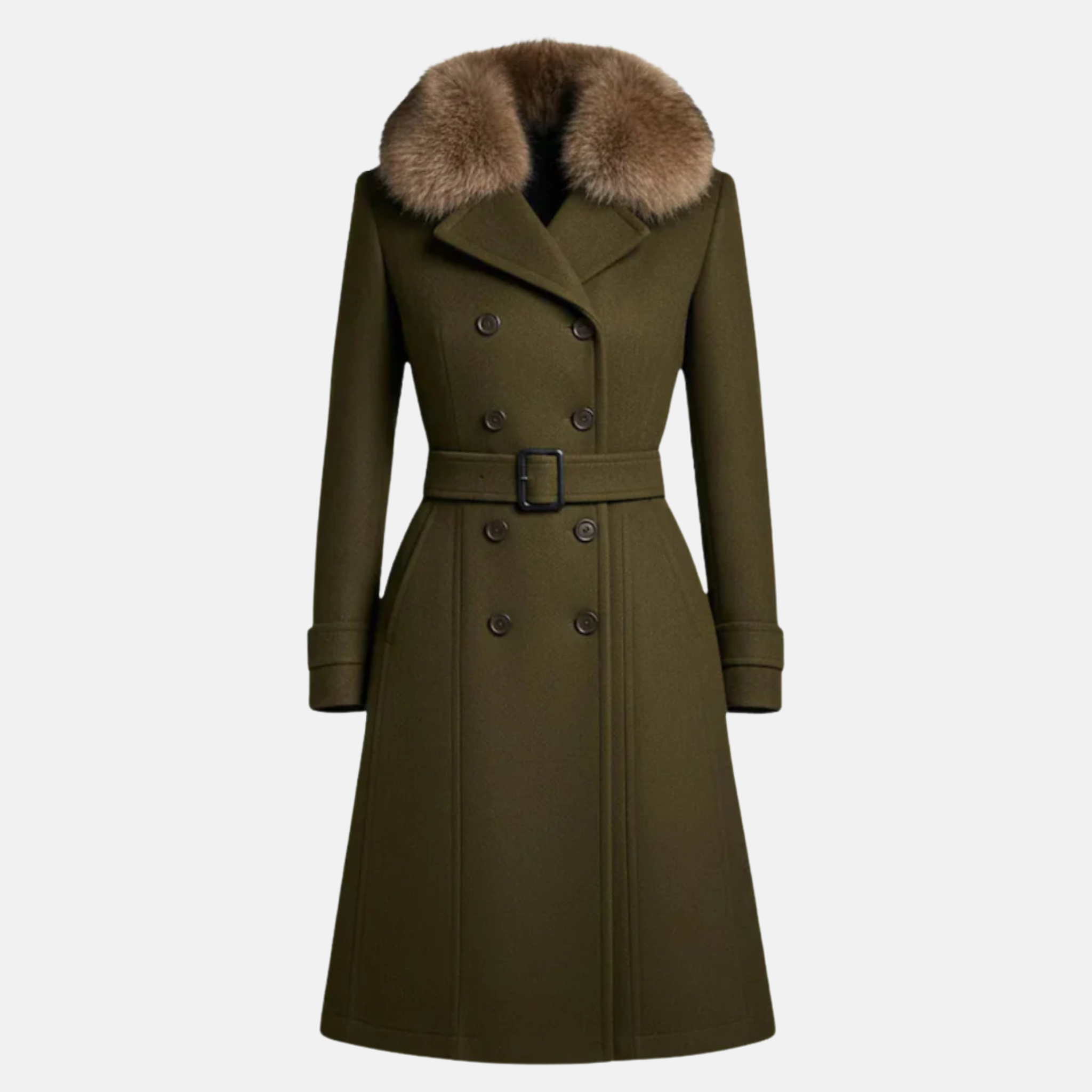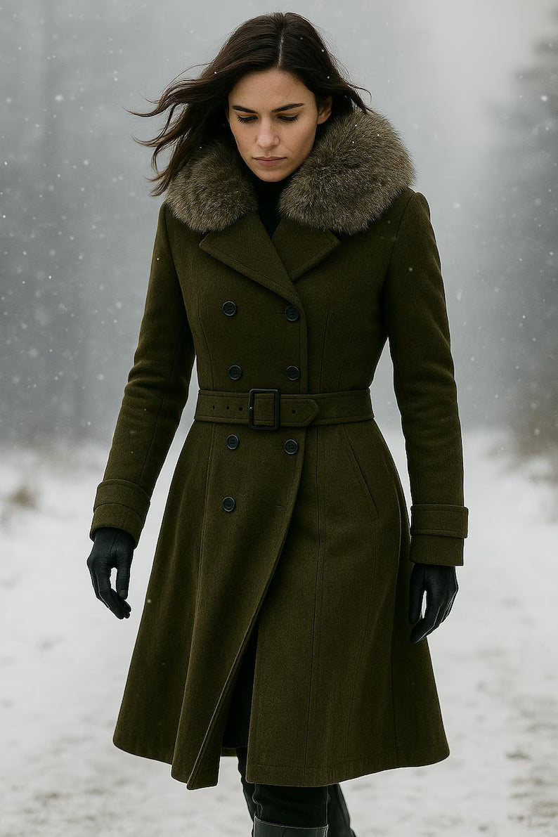 The luxurious faux fur collar adds a touch of glamour, while the belted waist and structured design create a flattering silhouette. Each detail from the polished buttons to the rich olive tone reflects expert craftsmanship and a tailored finish.