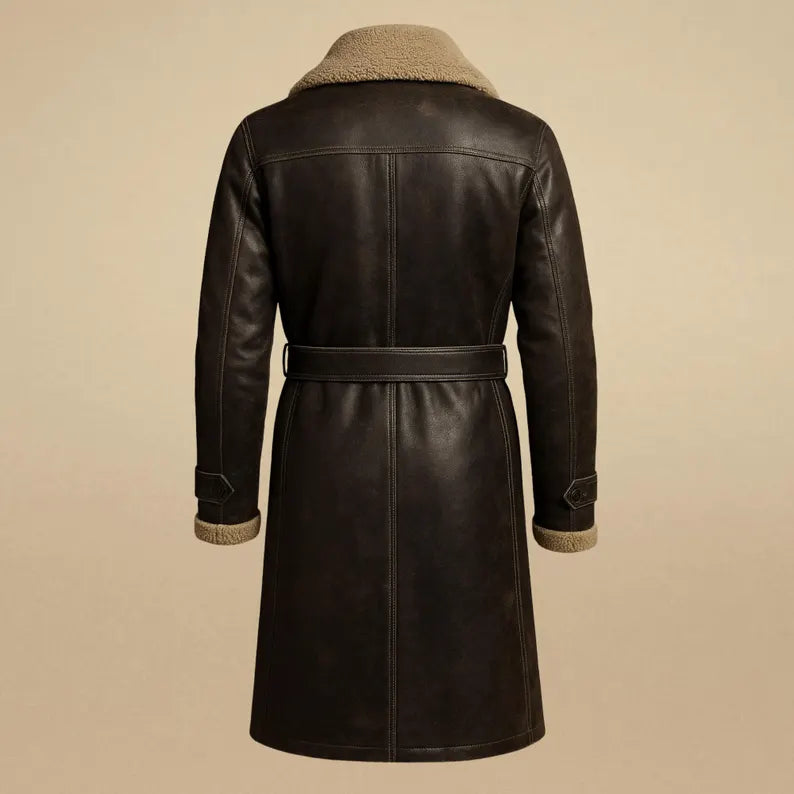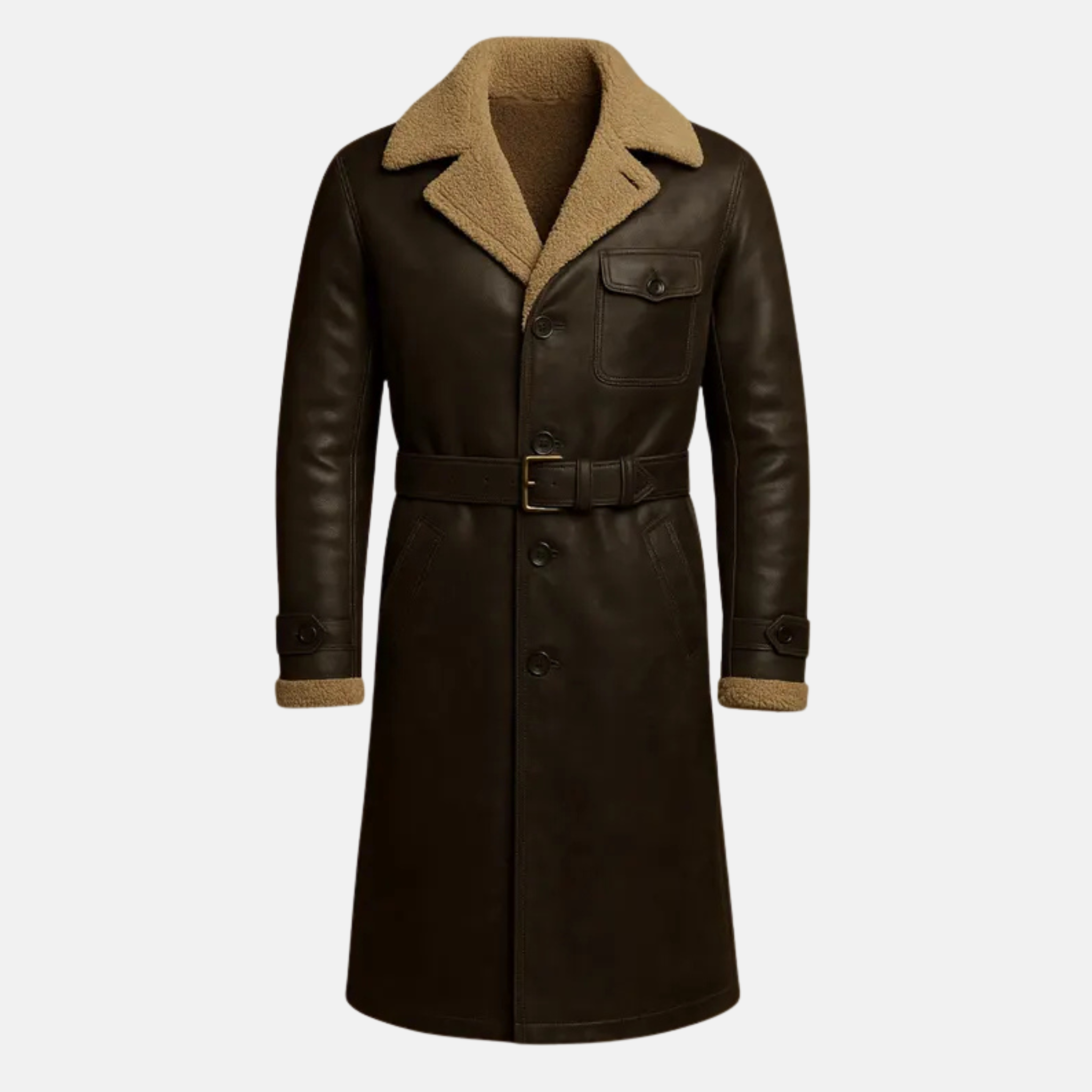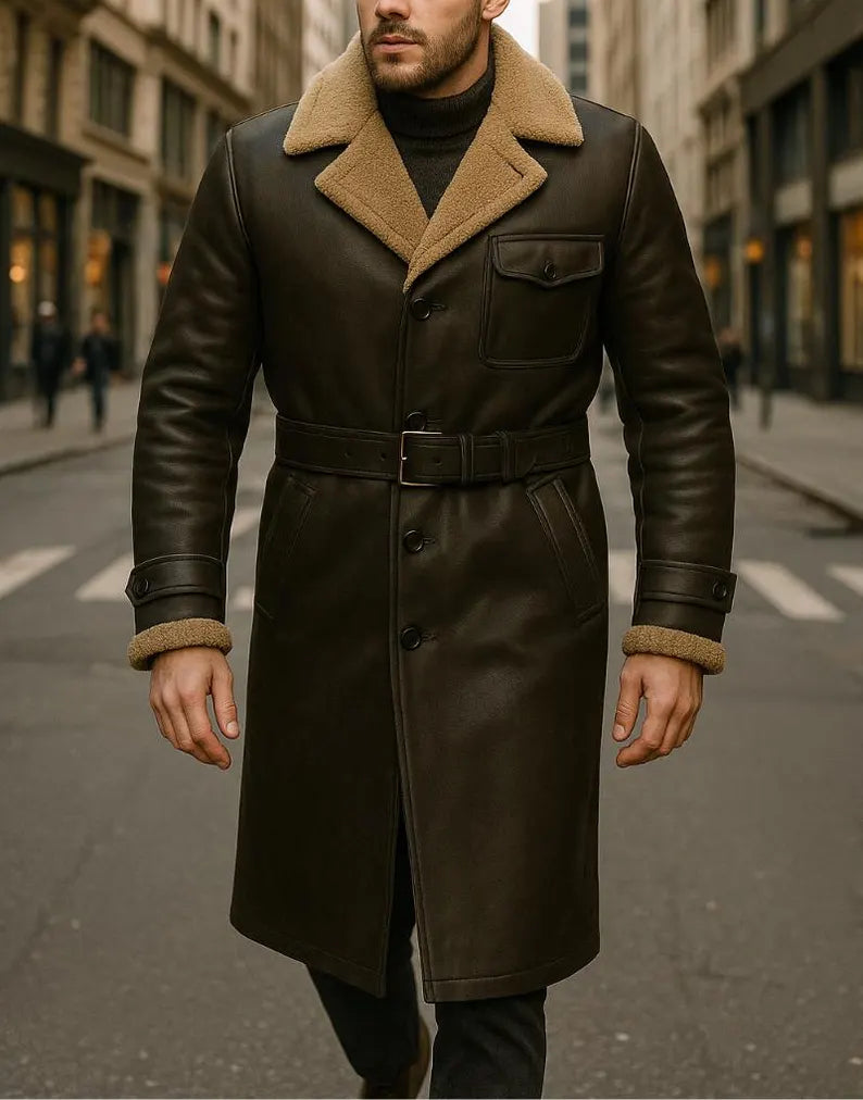 Step out in timeless winter style with this men’s long brown leather trench coat, handmade from 100% genuine leather and lined with soft faux shearling for extra warmth and comfort. This full-length belted coat blends modern craftsmanship with vintage inspiration — a perfect piece for cold-weather elegance.