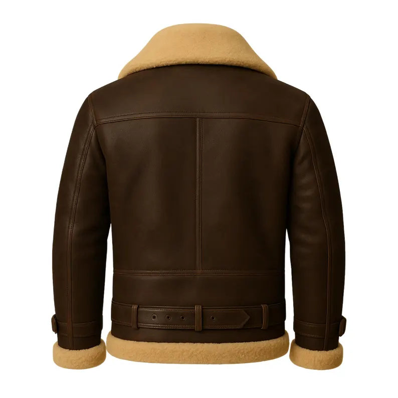 Men’s Handmade Shearling Leather Bomber Jacket – Real Leather Aviator Coat with Fur Collar & Belted Waist