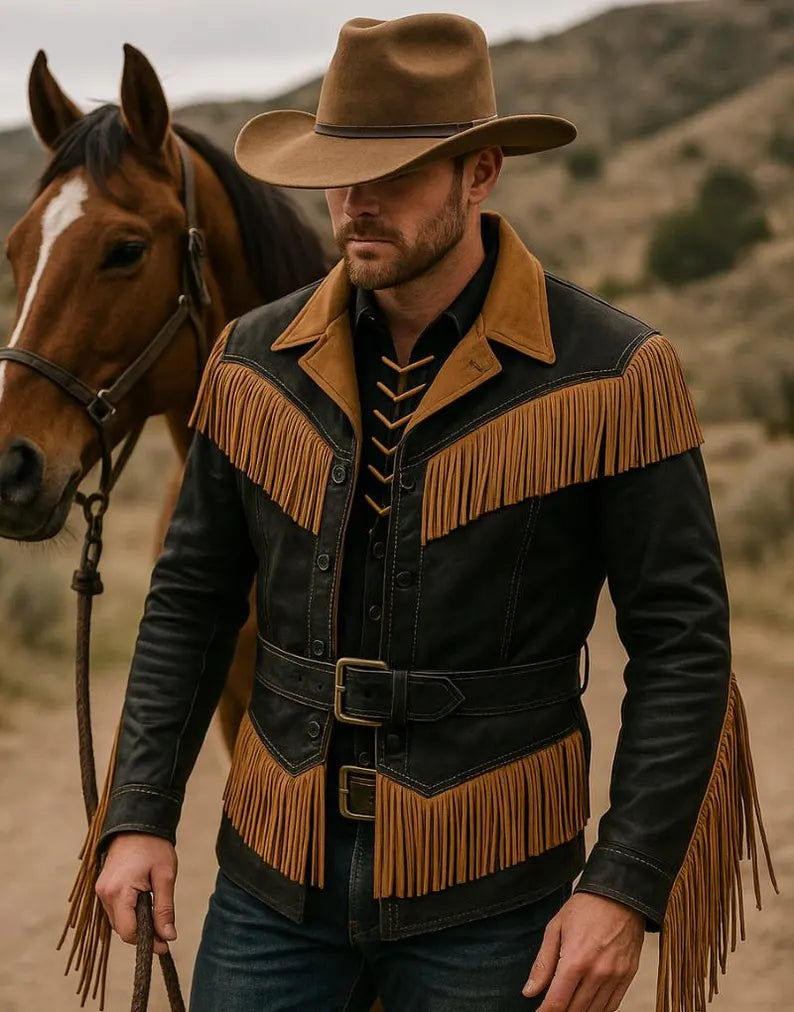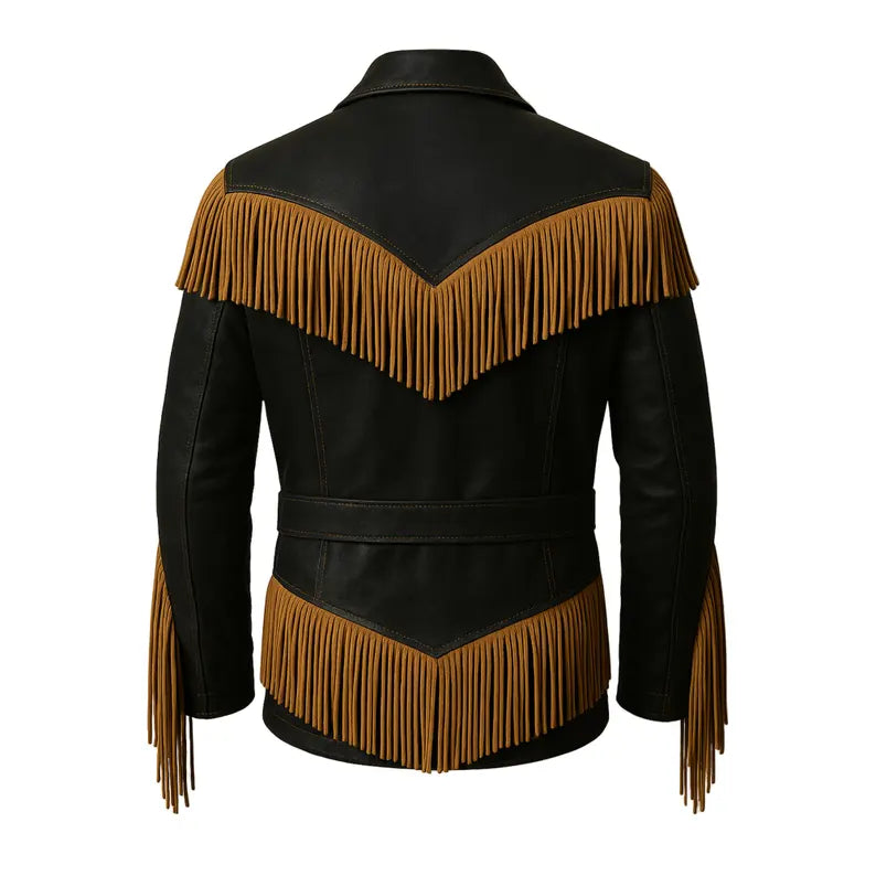 Made from premium quality leather, this jacket features dual-tone detailing, long fringes on the chest, sleeves, and back, and a matching waist belt that gives it a rugged cowboy edge.