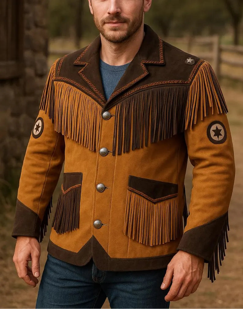 Step into classic western style with this Men’s Western Fringe Jacket, designed for those who appreciate timeless cowboy fashion. Featuring contrast dark brown detailing, decorative shoulder patterns, and long fringes on the chest, arms, and back — this jacket adds bold character to any outfit.