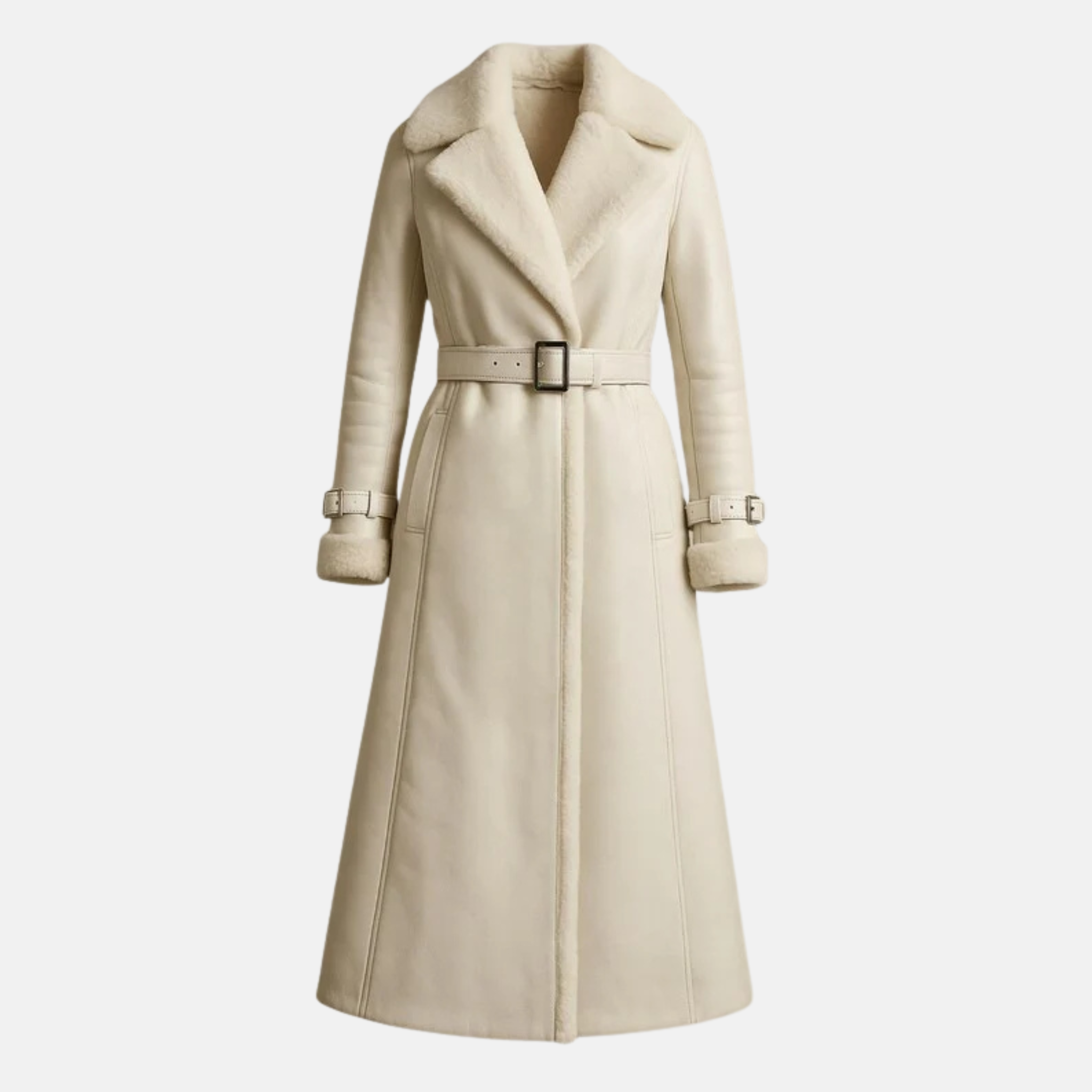 Step into timeless elegance with this Women’s White Leather Trench Coat, inspired by vintage 90s fashion and tailored in a chic military style. Designed with a fur-lined interior for extra warmth and comfort, this midi-length winter coat is both stylish and practical.