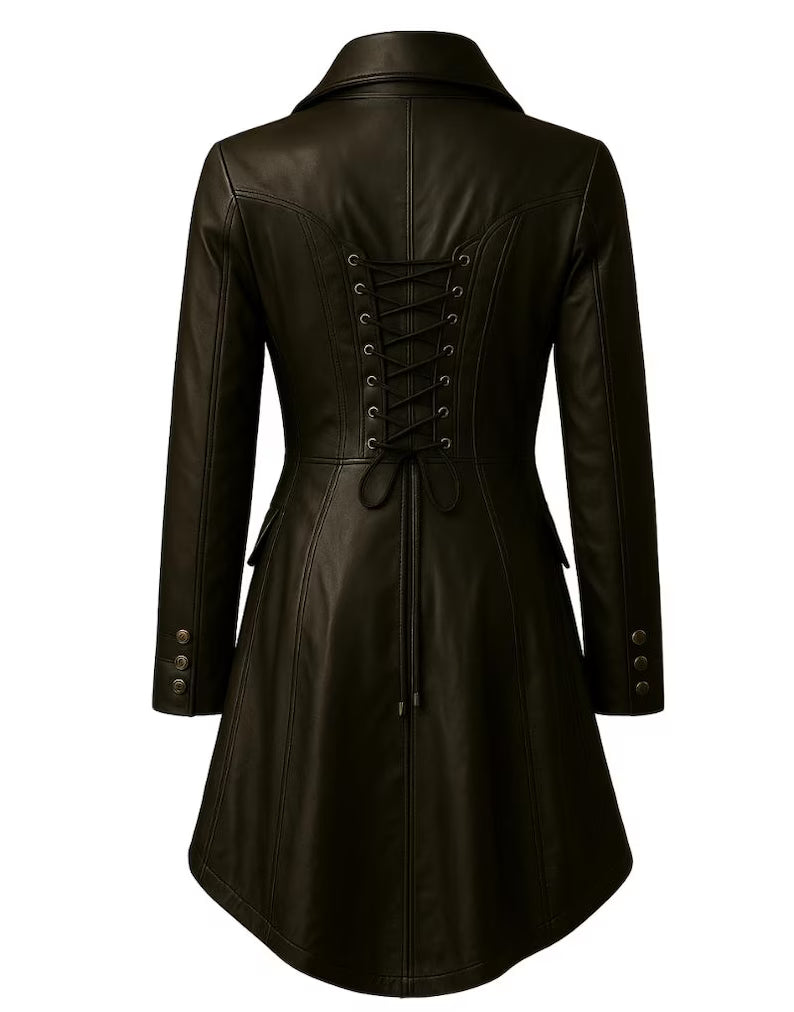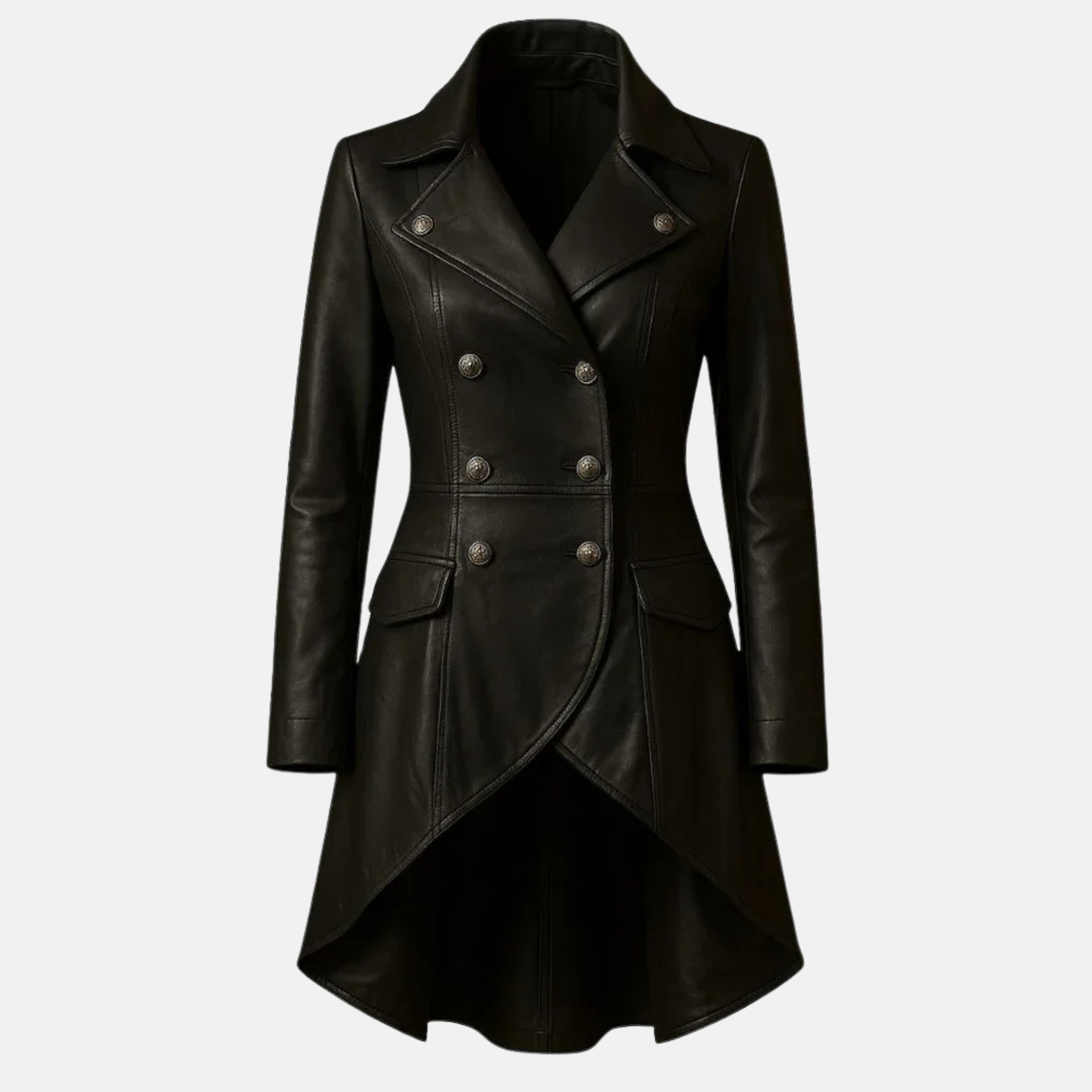 This long black leather coat for women is a wardrobe essential for those who want a refined and elegant outerwear option without extra detailing.