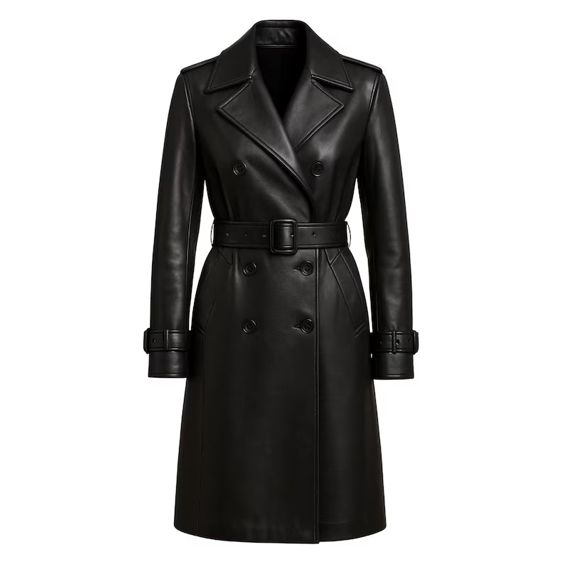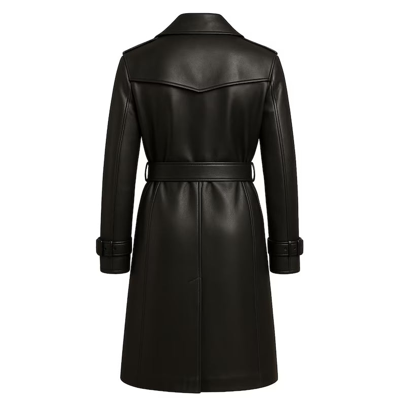 Made from high-quality genuine leather, this double-breasted trench features a classic belted waist, smooth finish, and tailored structure that defines luxury fashion.