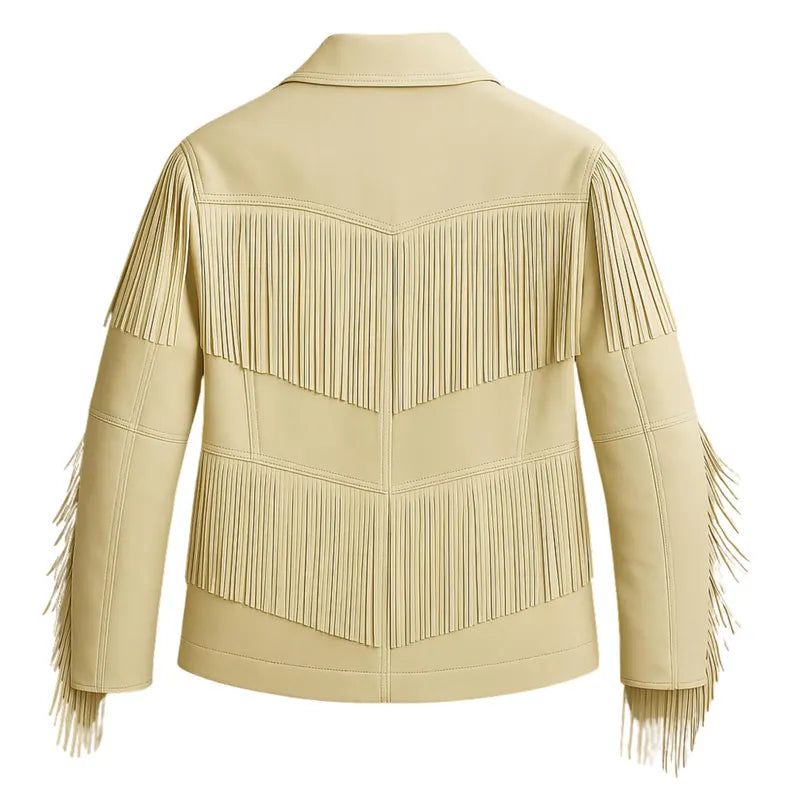 Made from premium quality real leather, this jacket features long western fringes on the chest, back, and sleeves — giving it a bold cowgirl-inspired vibe with a touch of elegance.
