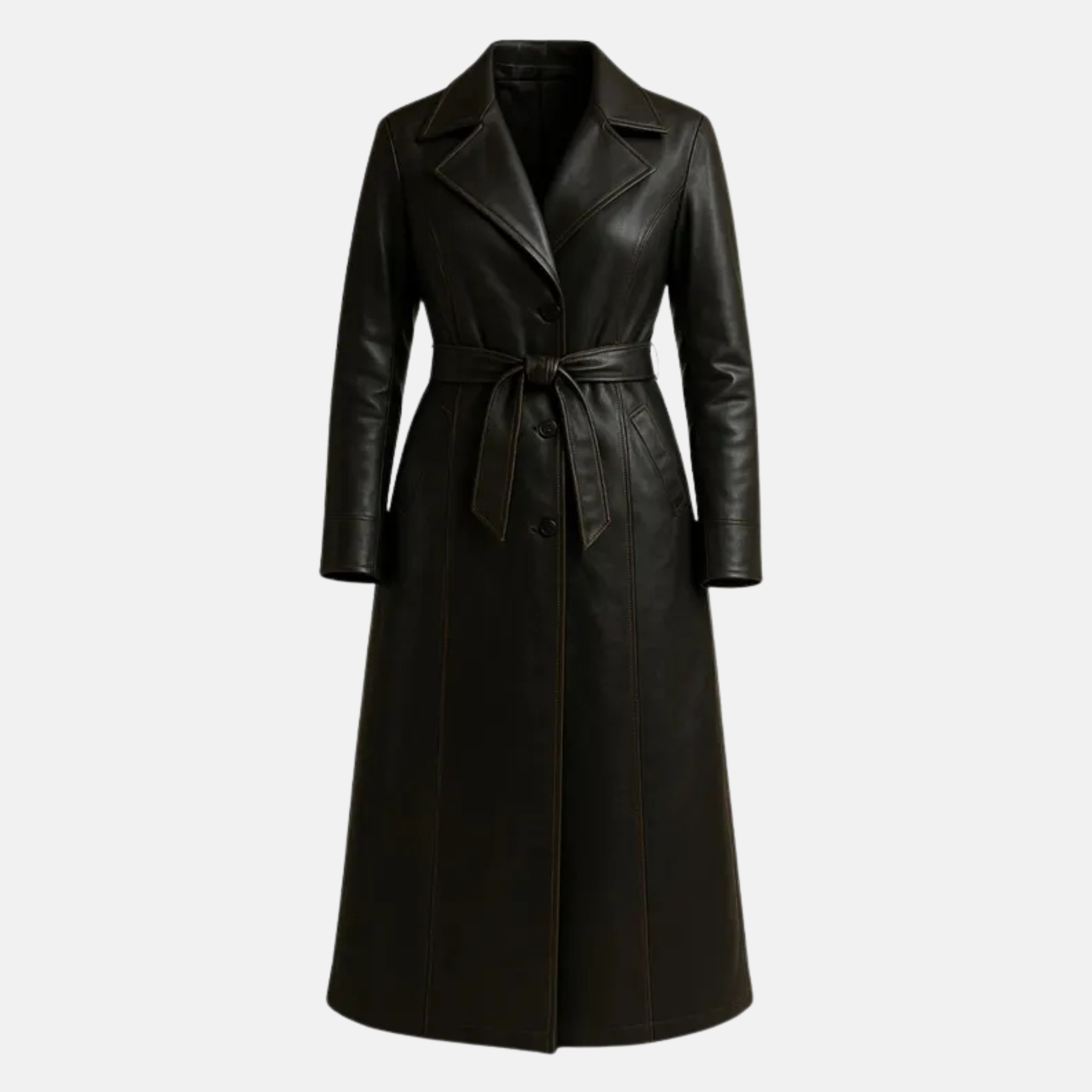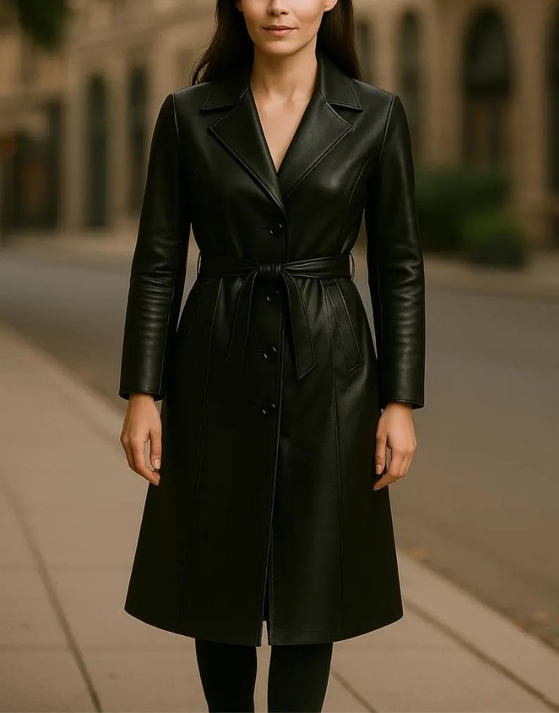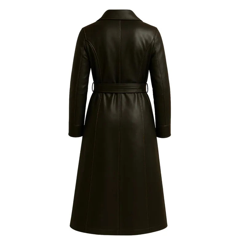 Made from high-quality real leather, this full-length coat features a flattering belted waist, smooth button closure, and a tailored silhouette that enhances every look.