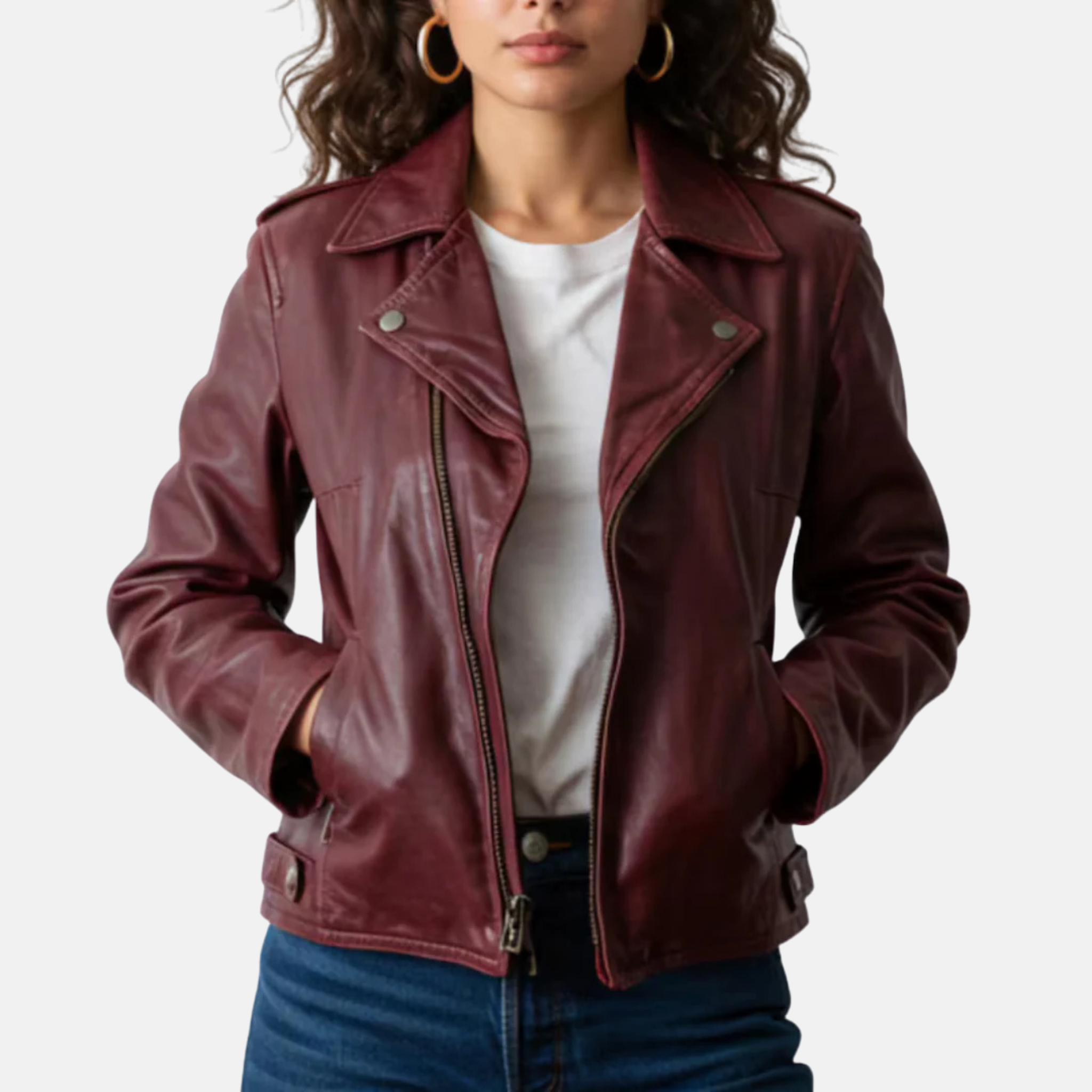Elevate your wardrobe with this women’s maroon genuine leather jacket, designed in a timeless biker style. Handmade from 100% real leather, this jacket combines durability, luxury, and effortless style. Featuring a sleek front zipper, snap collar, and side pockets, it’s perfect for casual outings, date nights, or city adventures. The rich maroon shade adds sophistication while the soft inner lining ensures all-day comfort. This versatile piece pairs easily with jeans, skirts, or dresses, making it an essential for every fashion-forward woman. A must-have leather outerwear for fall and winter seasons that offers both warmth and confidence.