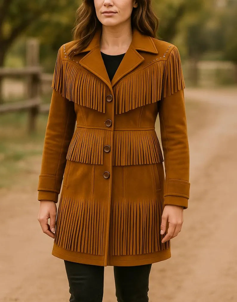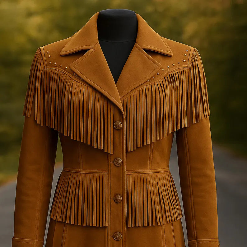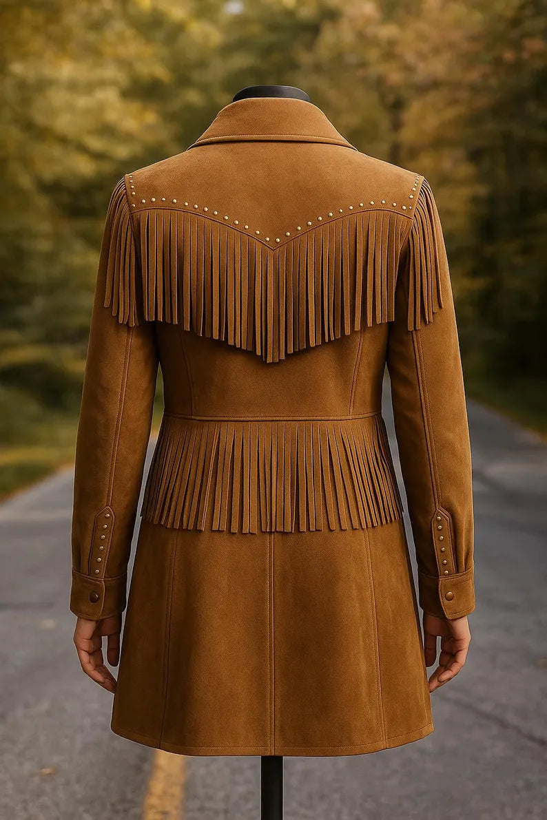 This jacket is ideal for women searching for fringe leather jackets, western cowgirl coats, boho festival outfits, or studded vintage jackets.