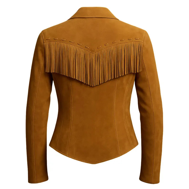 Made from premium suede leather, this cowgirl-inspired piece features elegant fringes across the chest and back, giving it a bold and classic western touch.