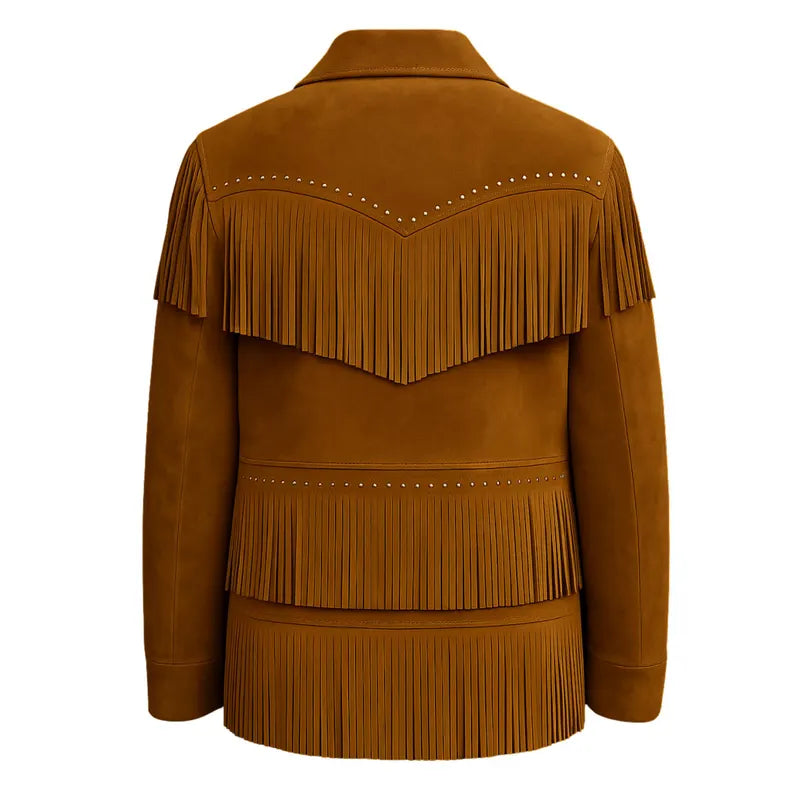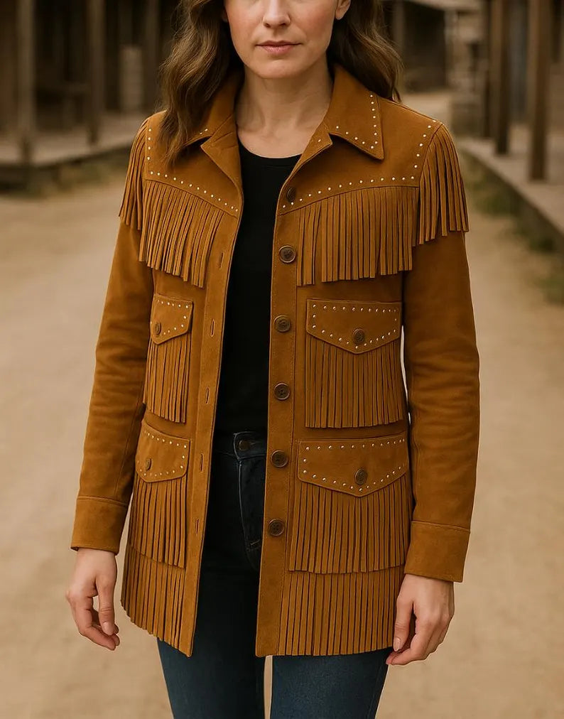 Step into timeless western elegance with this handcrafted Women’s Suede Fringe Jacket. Made from 100% genuine suede leather, it features soft tan color tones, long western-style fringes, and decorative metal studs that add a bold cowgirl touch.