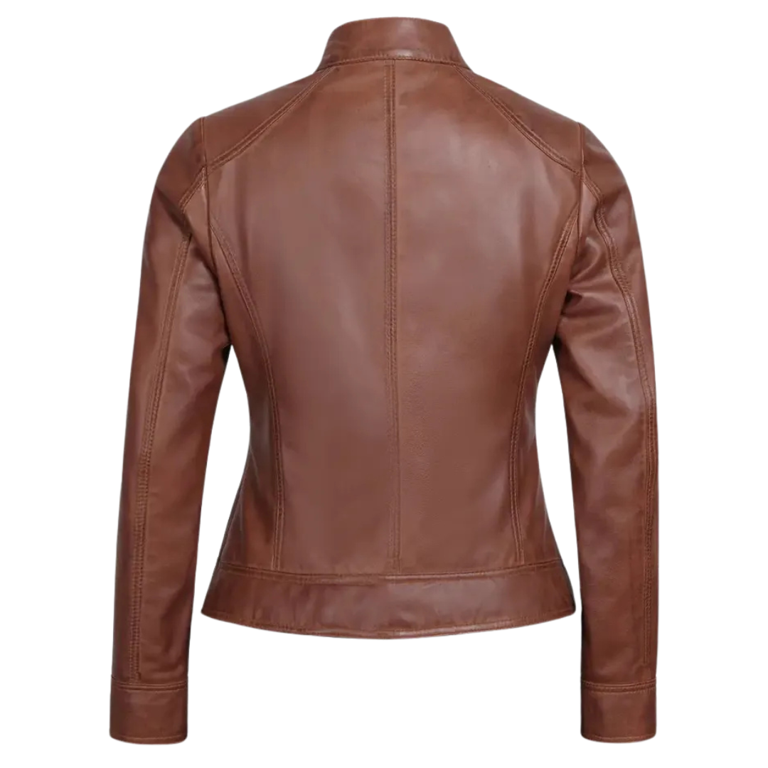 Turn heads in this cognac brown cafe racer leather jacket. Built with a streamlined zip front, chest zip pockets, and a structured fit for bold, everyday style. Soft inner lining adds comfort, while the rugged leather finish makes it ready for any outing.